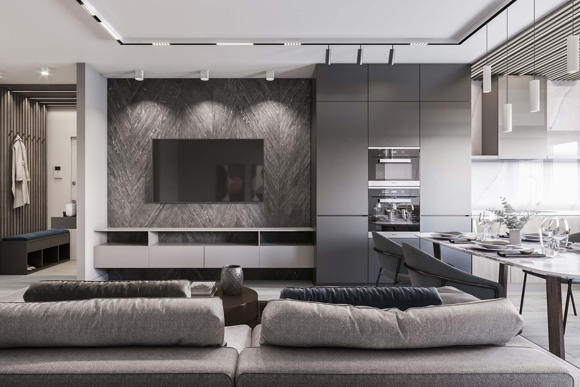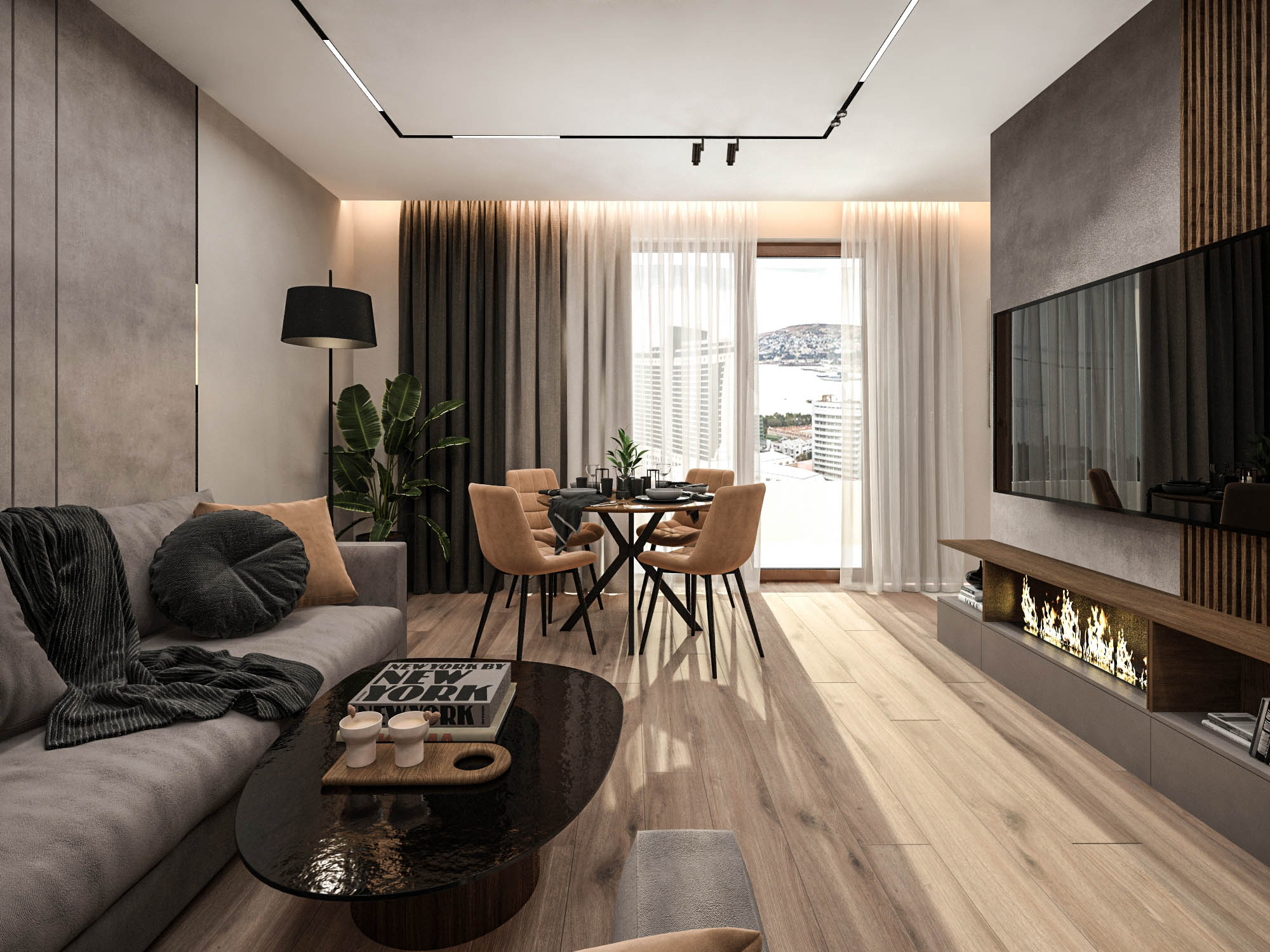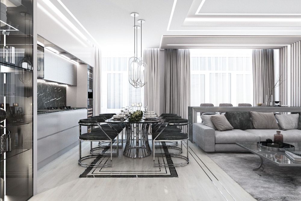 Typically: interior concept, apartment layout options, mood boards, color & material suggestions, 3D visualizations (renders), and technical drawings (plans, elevations, specifications). The scope is tailored to each project.