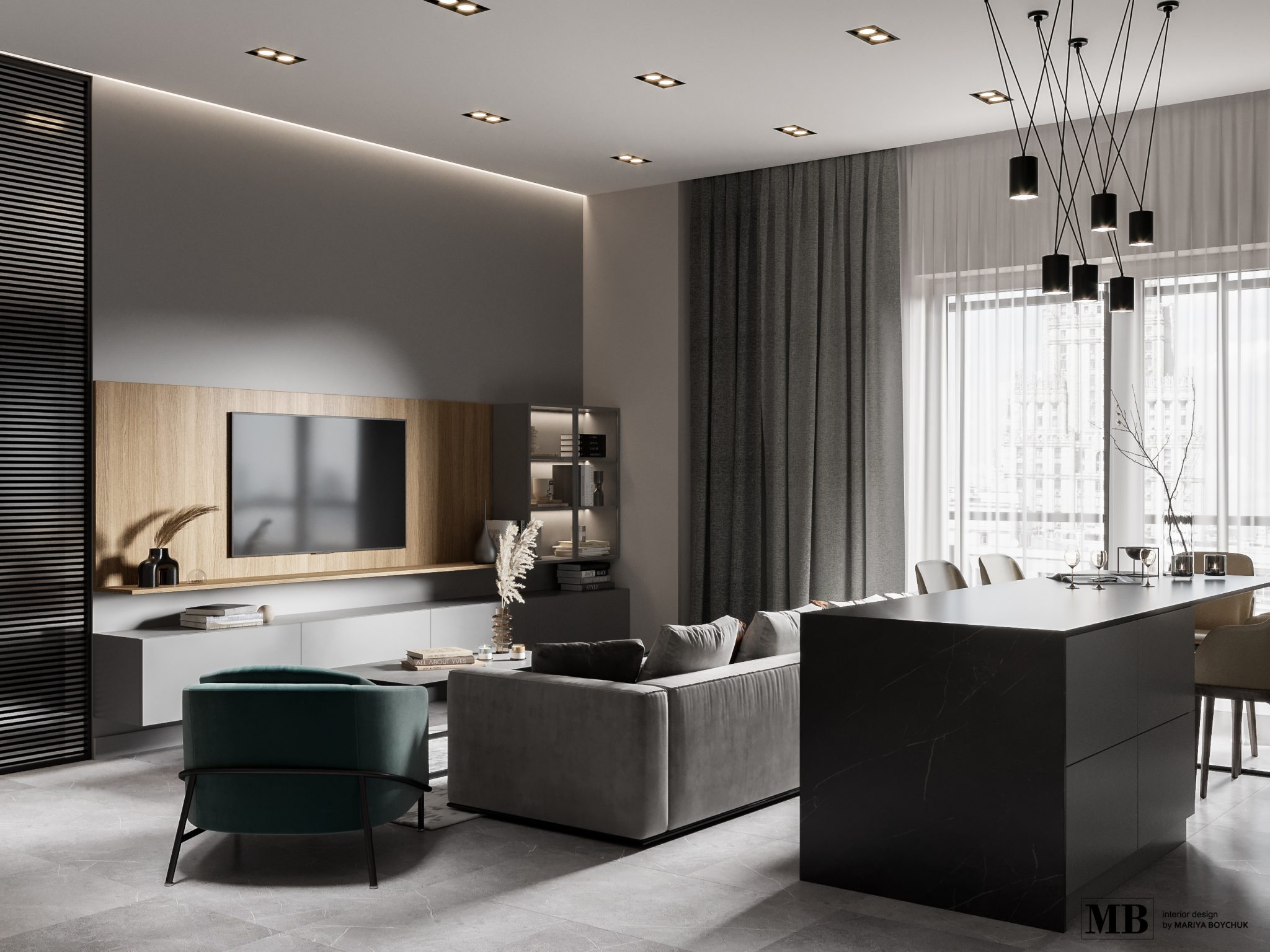 Typically: interior concept, apartment layout options, mood boards, color & material suggestions, 3D visualizations (renders), and technical drawings (plans, elevations, specifications). The scope is tailored to each project.
